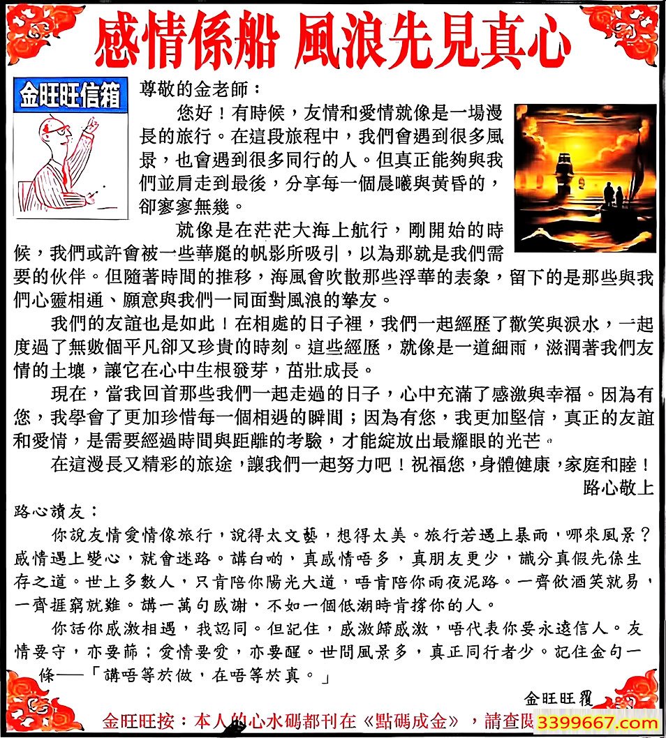 主题 :095期:金旺旺信箱彩民推荐→→《感情係船 風浪先見真心》 |