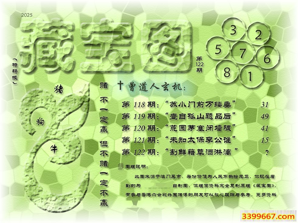 122期藏寶圖 新:割鲜籍草酒淋漓 老:日暮沙场飞作灰 禁:猴 禁:0尾 玄機字:《将》