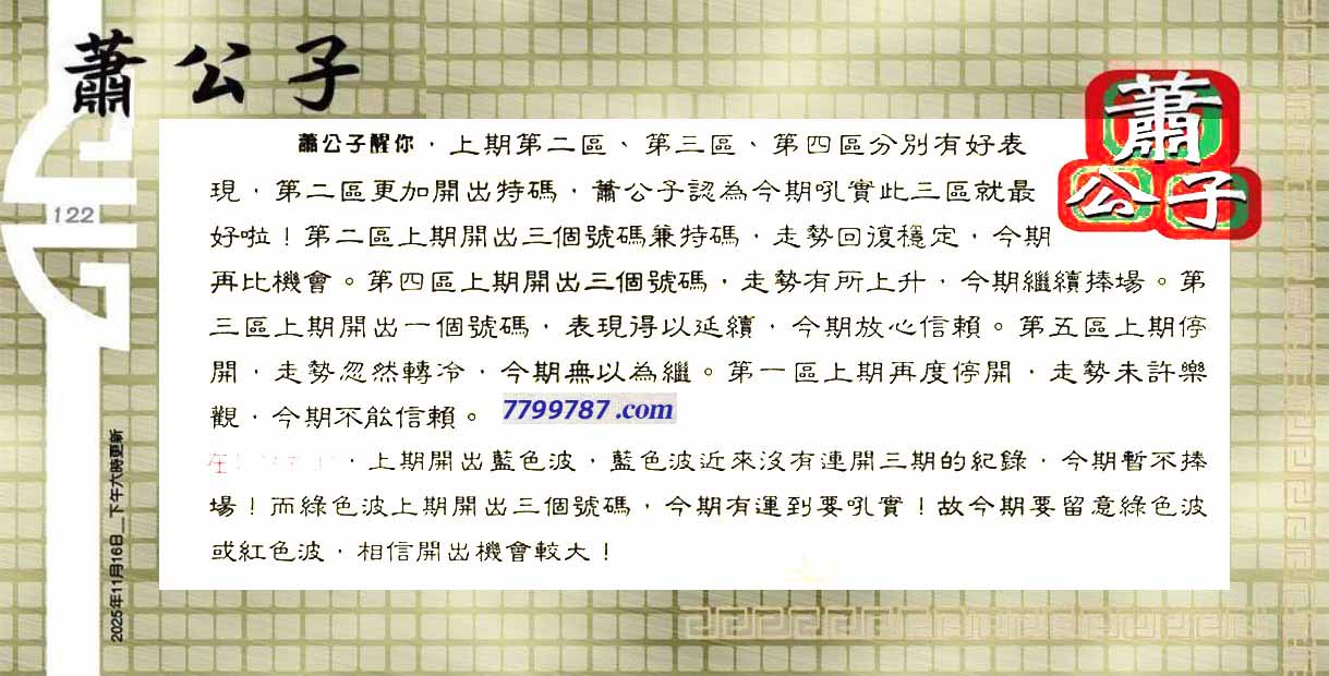| 主题 :122期:六合皇金句/老总论码/萧公子/林大师/五行夺码/老总信箱截 |
