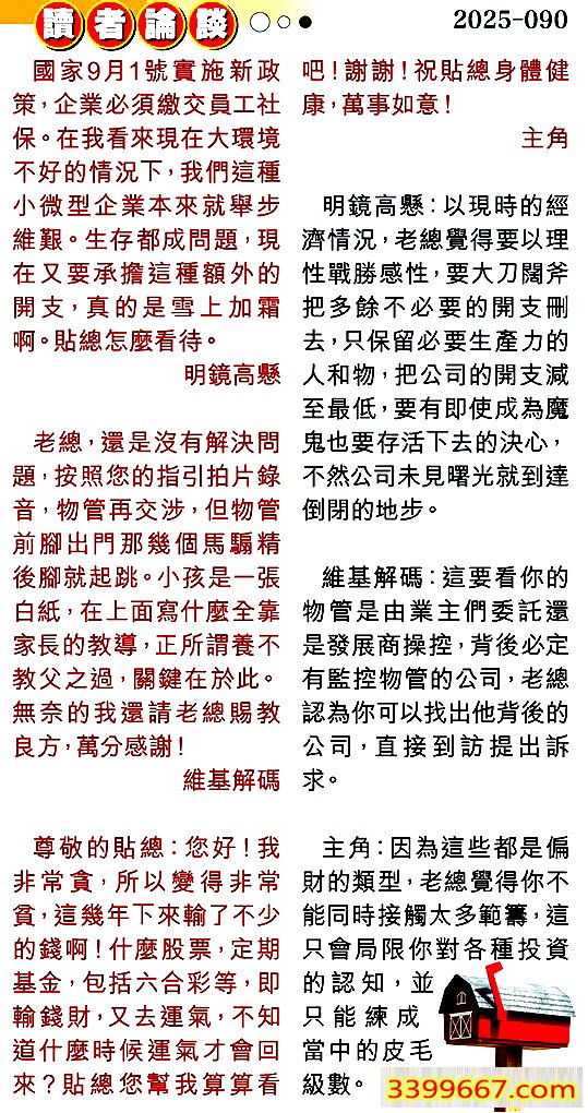 | 主题 :090期:彩民推荐〖貼信讀者論壇〗 |