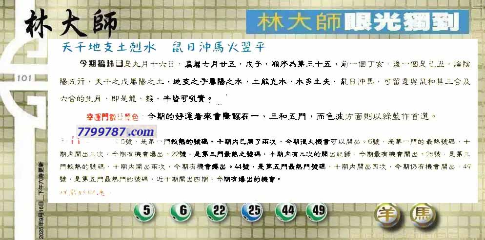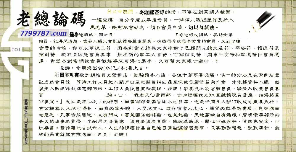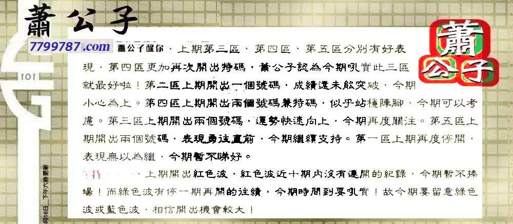 | 主题 :101期:老总论码/萧公子/林大师/五行夺码 |