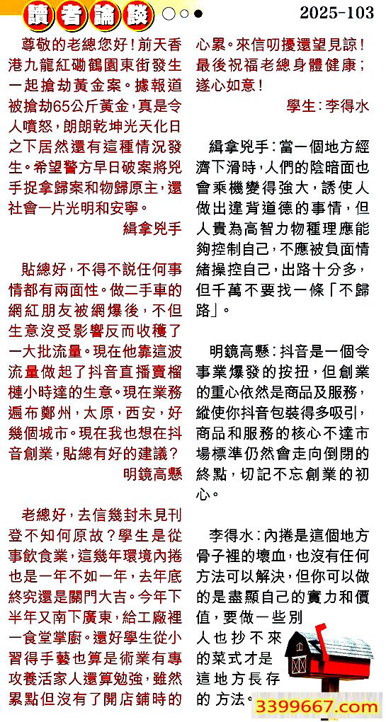 | 主题 :103期:彩民推荐〖貼信讀者論壇〗 |
