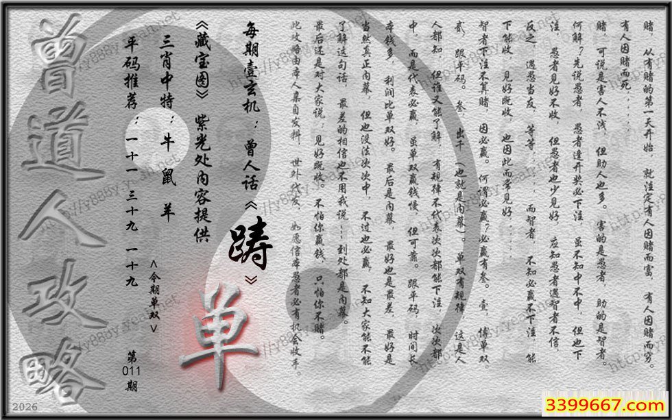 主题 :011期藏寶圖 新:因想后湖题柱处 老:汉城黄柳映新帘 禁:虎 禁:4尾