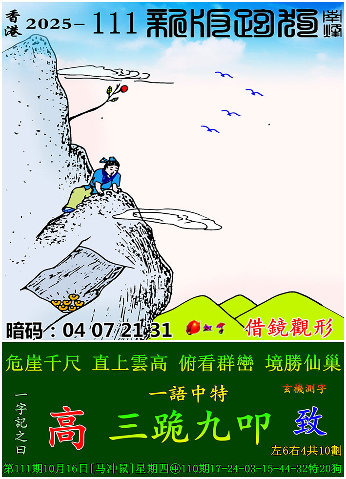 | 主题 :111期:新版跑狗一字記之曰【高】 玄機測字:【致】 |