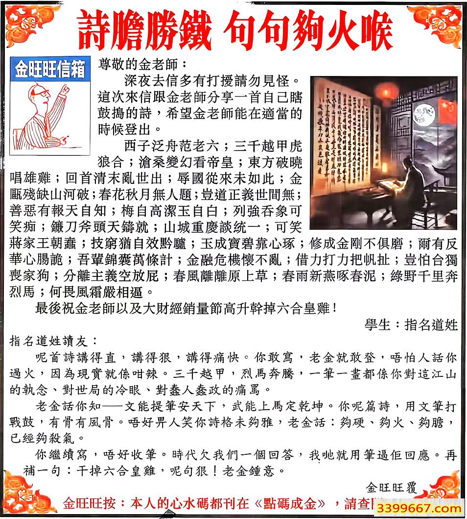 111期:金旺旺信箱彩民推荐→→《詩膽勝鐵 句句夠火候》